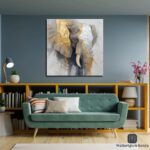This stunning contemporary elephant portrait merges classical wildlife subject matter with modern abstract expressionism. The piece features a magnificent elephant rendered in a sophisticated palette of gold leaf, charcoal grays, and soft whites, with subtle touches of sage and warm earth tones. The artist employs a masterful technique that blends realistic anatomical detail—particularly evident in the textured skin, prominent tusks, and intelligent eye—with loose, gestural brushwork that creates atmospheric depth and movement.